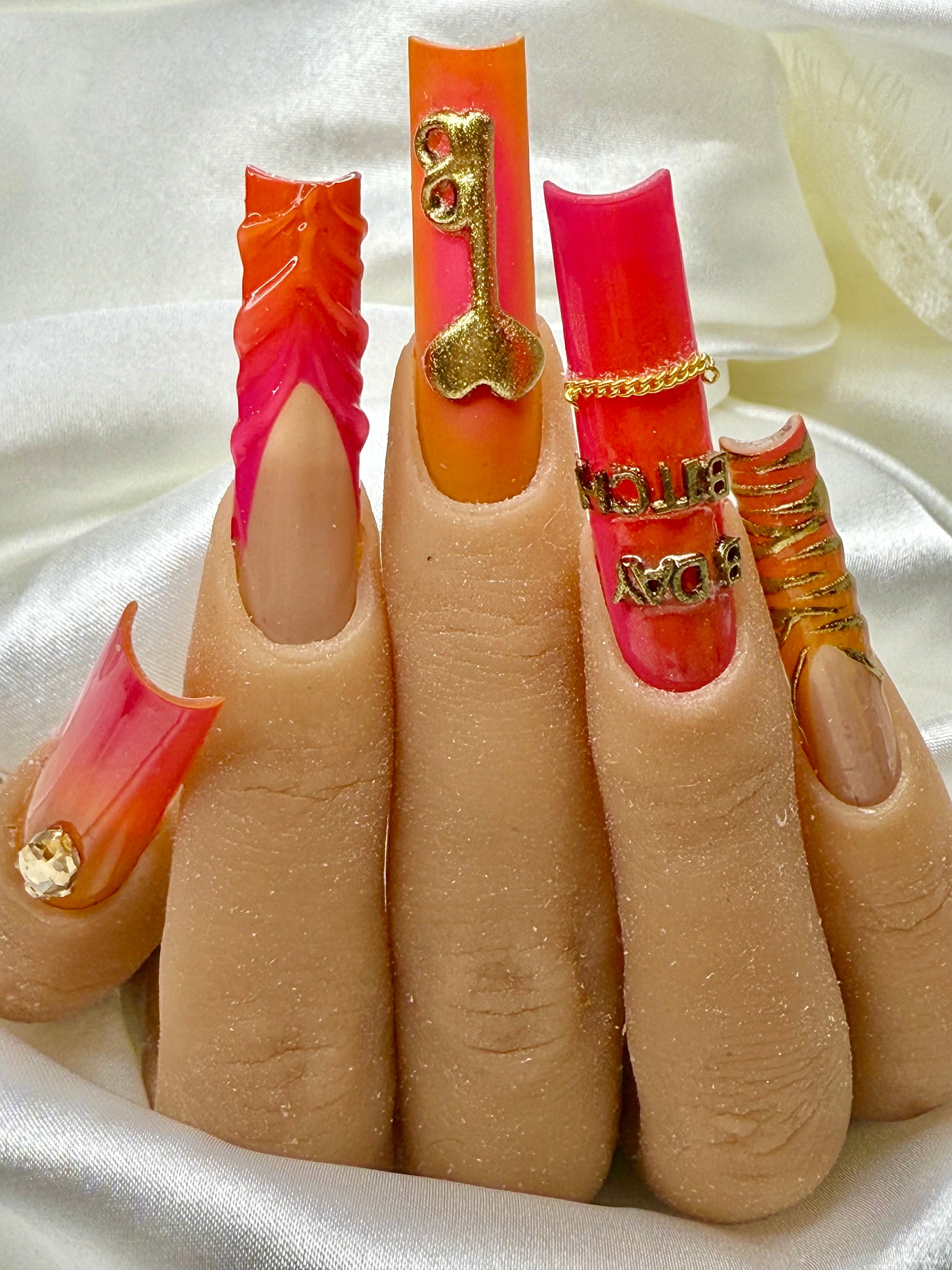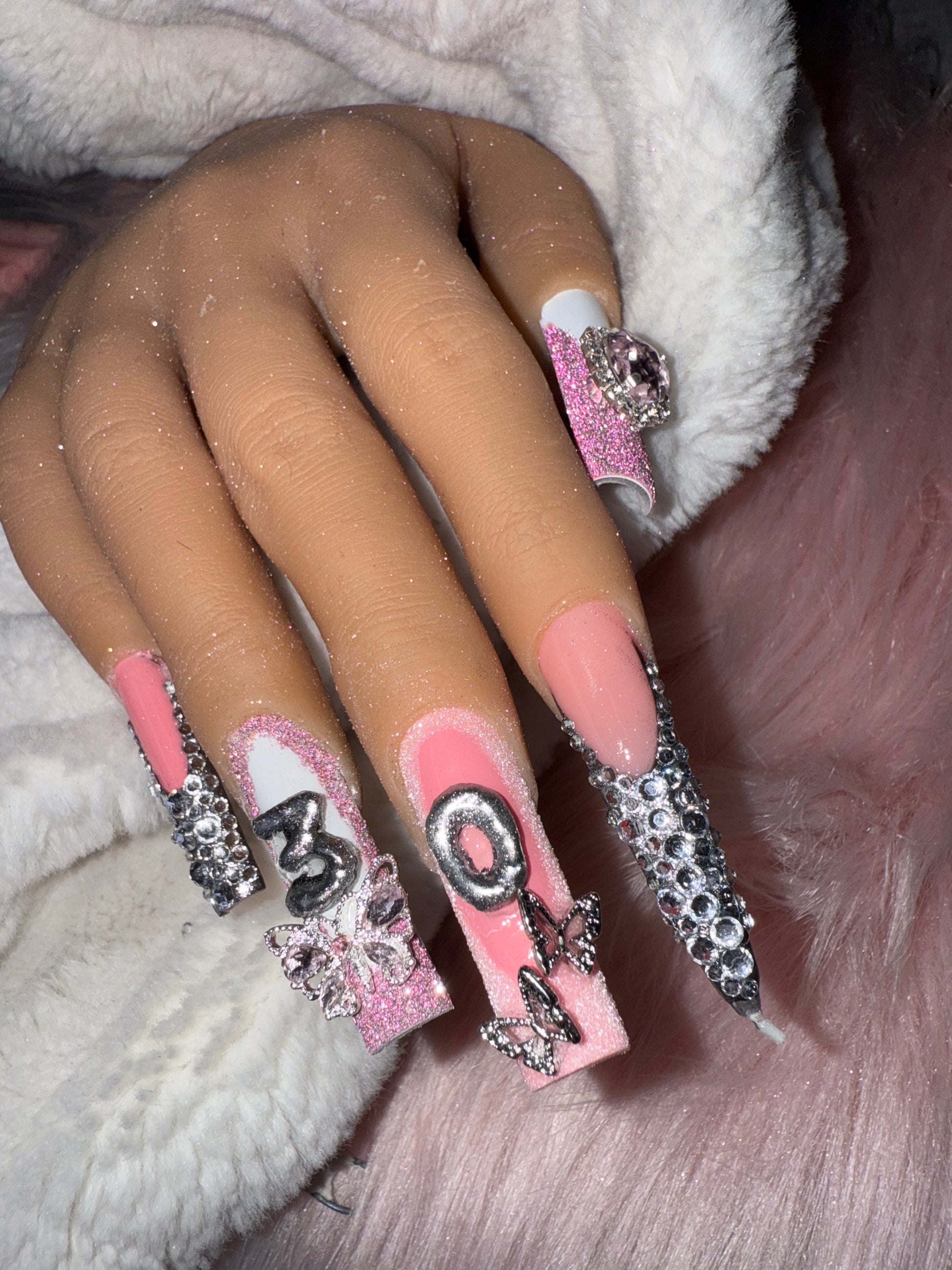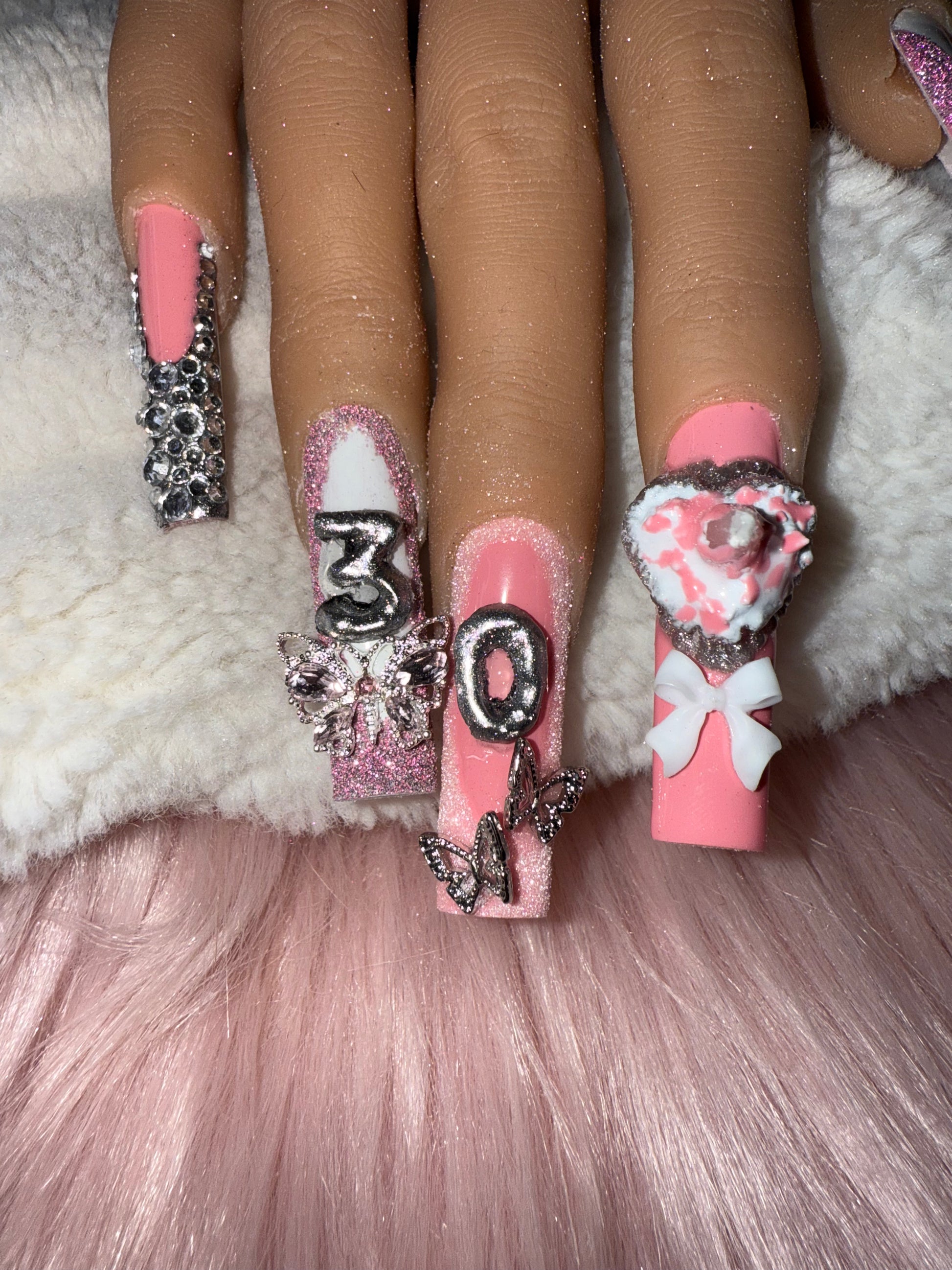 The ultimate birthday set for main-character energy. Soft pink base, glitter fades, crystals, bows and 3D details — finished with a real mini candle inserted into the nail for that extra wow factor. Light it up for pics, vibes, and full birthday drama.